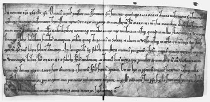 Everger von Köln, der von 985 - 999 als Erzbischof nachzuweisen ist, genießt in der Kirchengeschichte keinen besonders guten Ruf. Er soll Klöster beraubt, deren Güter eingezogen und an seine Ritter verteilt und auch sonst in der Reichspolitik eher eine zwielichtige Rolle gespielt haben. Das Kloster Groß St. Martin in Köln aber verdankt ihm jedenfalls eine Grundausstattung mit Besitz und Einkünften, die, wie wir noch sehen werden, recht beachtlich war. So ist es kein Zufall, dass das Kloster gerade diese Urkunde mehrfach abgeschrieben und schon in den ältesten erhaltenen Kopiaren, den Kopienbüchern, an die erste Stelle gesetzt hat. Allerdings hat die Wissenschaft diese Urkunde zeitweise als Fälschung angesehen. Die Kritik an der Echtheit bestand zum einen darin, dass die Urkunde in zwei, leicht voneinander abweichenden Originalen existiert, bei der einen Ausfertigung wohl ein falsches Siegel hängt, und zum anderen darin, dass der in der Urkunde als Kaiser genannte Otto III. im Jahre 989 noch gar nicht Kaiser war. Zum Kaiser gekrönt wurde Otto erst im Jahre 996.